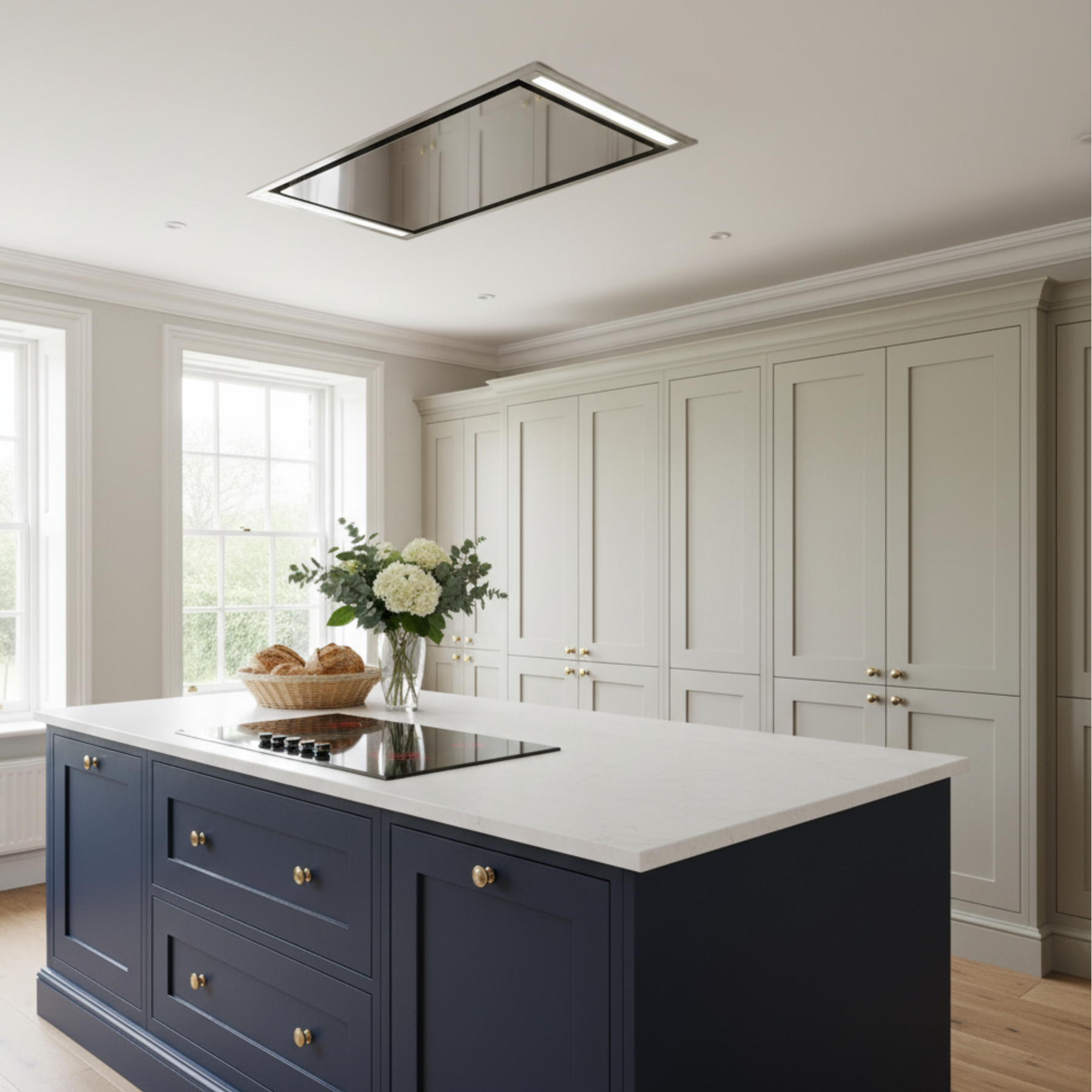 The Mille Ceiling Cooker Hood offers premium flush-mounted extraction with a choice of two powerful brushless motor options and two stylish colour finishes – White, or Brushed Stainless Steel. Designed for modern kitchens, its A-rated motor delivers up to 780m³/hr airflow for efficient removal of steam, smoke, and odours.